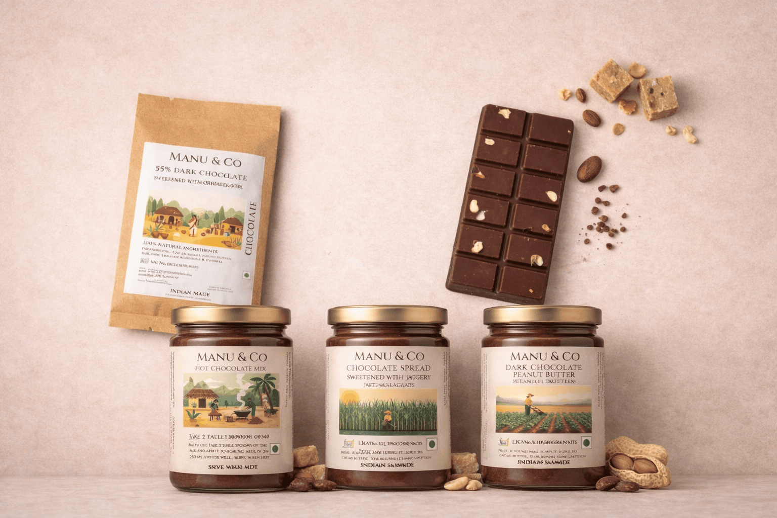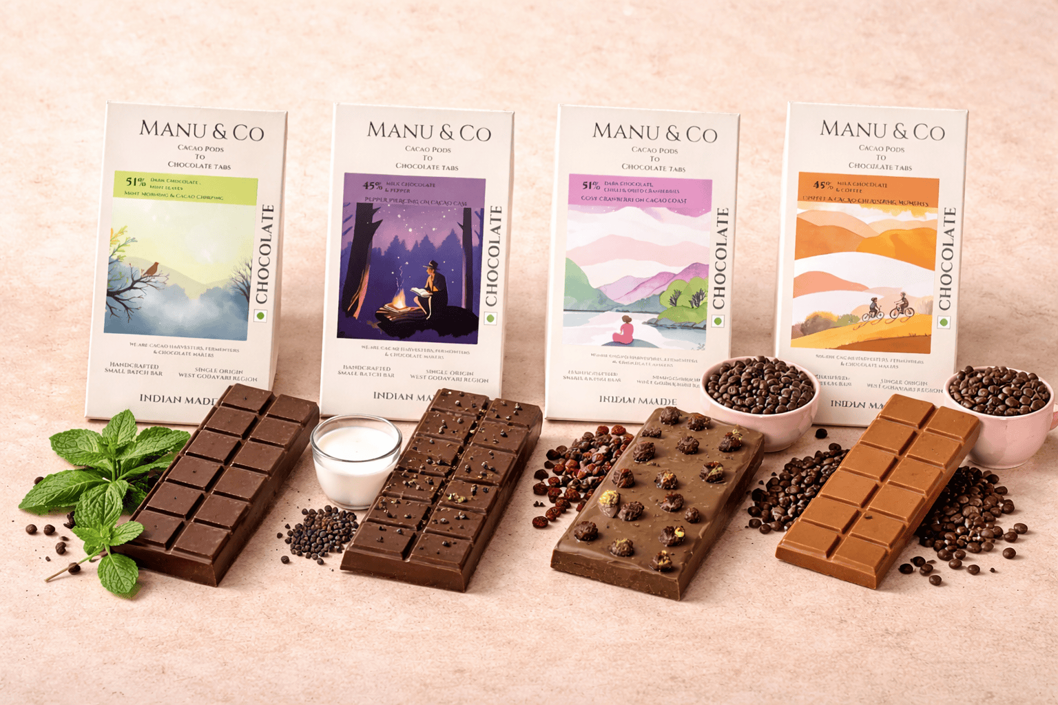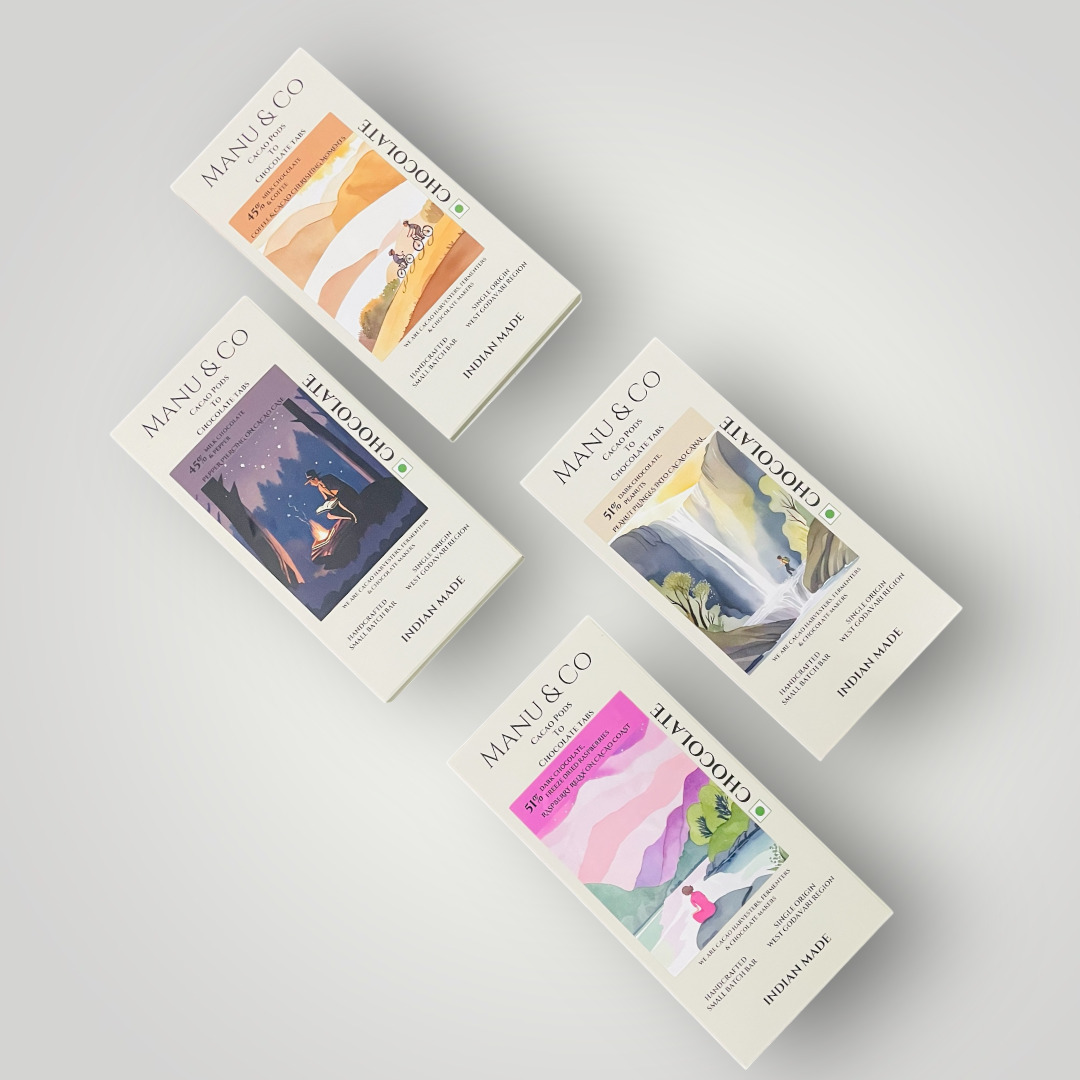 Our Chocolate making process begins with harvesting ripen cacao pods (Grown in West Godavari region in Southern India , where our chocolate unit is present) and carefully extracting the beans. These beans are then fermented at our fermentation unit and sun-dried carefully, naturally using drying rakes to develop their flavor. Next, the dried beans are roasted, cracked, and winnowed to separate the nibs from the shells. The nibs are then stone-ground traditionally using the stone-melangers to achieve a smooth texture. Then the chocolate goes into the tempering process . After tempering, the chocolate is poured into molds and cooled to create the final bar. Tree-to-bar approach emphasizes quality, traceability, and often sustainability, with a strong connection between Manu & Co and the cacao-growing community.